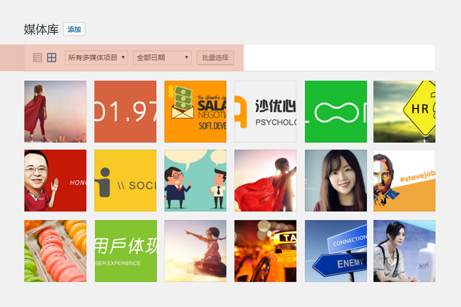 打开后台菜单“媒体-媒体库”,就可以看到已经上传了的媒体文件。上面的一行菜单,可以根据不同条件调整媒体的显示。